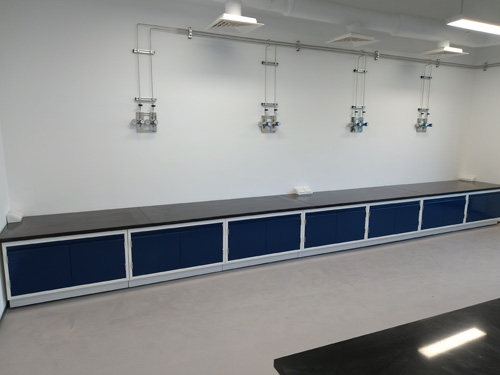 3.移動背板:中臺的中部(衣柜平開門背影)為裝置隔層,壁柜后背有可移動檔板,使用在隱秘從屋面預埋或吊頂天花板吊頂板生成工作柱到實驗室設備工作臺面的電、氣液壓管路,可在無需絲毫用具的情況下下加入處理節點。